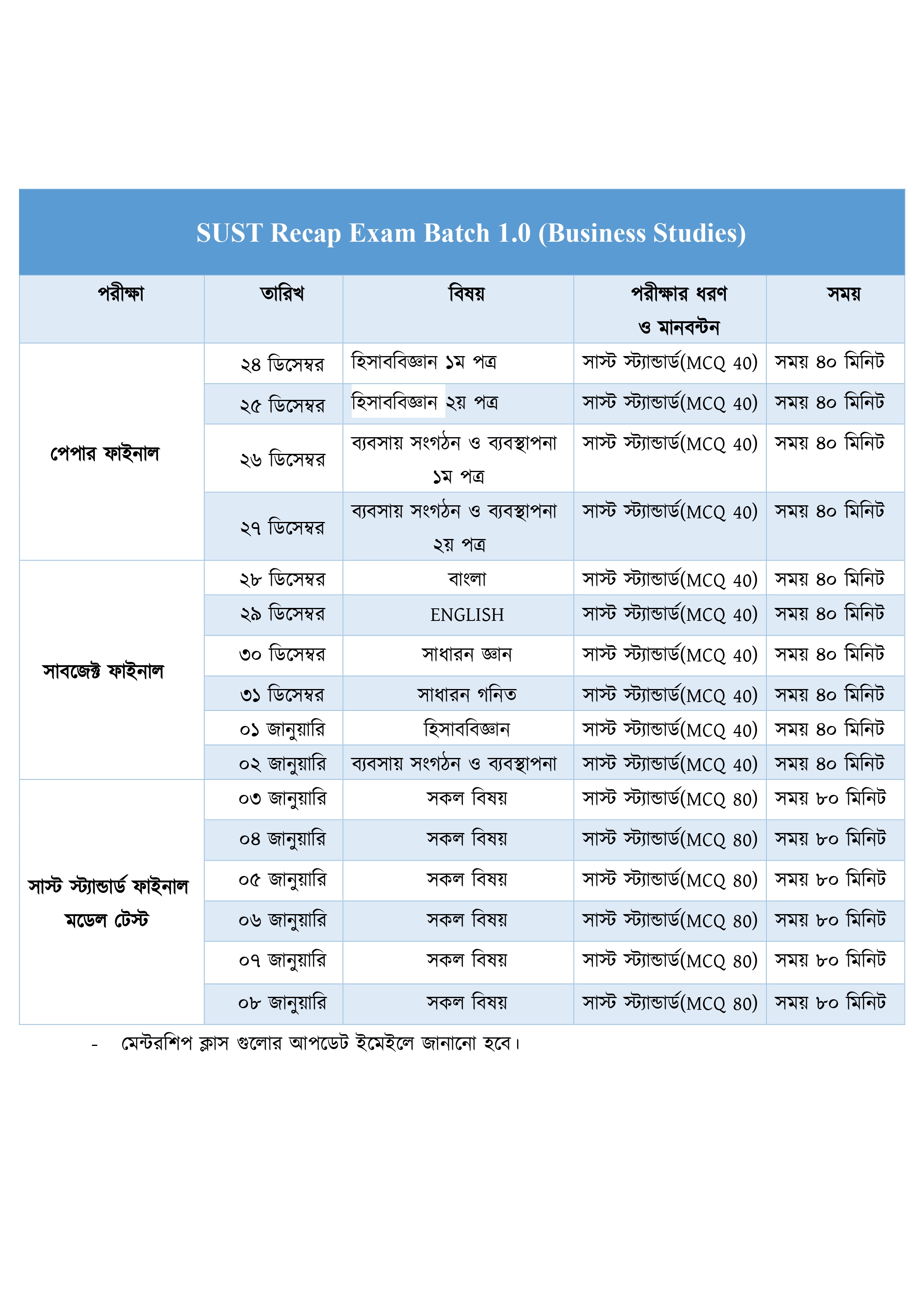 শাহজালাল বিজ্ঞান ও প্রযুক্তি বিশ্ববিদ্যালয় (SUST) ভর্তি পরীক্ষার চূড়ান্ত প্রস্তুতির জন্য SUST Recap Exam Batch 1.0 একটি সম্পূর্ণ এক্সাম-ভিত্তিক ব্যাচ। এই কোর্সের মডিউল বিশেষভাবে সাজানো হয়েছে তাদের জন্য, যারা ইতোমধ্যে সিলেবাস শেষ করেছো এবং পরীক্ষার আগে নিজের প্রস্তুতি যাচাই ও স্কোর উন্নত করতে চাও। ব্যাচের ফিচারসমূহ— ✅ লাইভ + প্র্যাকটিস এক্সাম (SUST ভর্তি পরীক্ষার স্ট্যান্ডার্ড প্রশ্ন প্যাটার্ন অনুযায়ী)) 🏆 লিডারবোর্ডের মাধ্যমে র্যাংকিং ও পারফরম্যান্স তুলনার সুযোগ 📊 অধ্যায়ভিত্তিক প্রশ্ন অ্যানালাইসিস 🧠 প্রশ্ন বিশ্লেষণ ও সঠিক সমাধান কৌশল ⏱️ টাইম ম্যানেজমেন্ট ও এক্সাম স্ট্র্যাটেজি ❓ ডাউট সলভ সাপোর্ট 🎓 ফ্রি মেন্টরশিপ প্রোগ্রাম কাদের জন্য উপযুক্ত? যারা শেষ মুহূর্তে শক্ত এক্সাম প্র্যাকটিস, আত্মবিশ্বাস এবং সঠিক দিকনির্দেশনার মাধ্যমে নিজের সর্বোচ্চ পারফরম্যান্স নিশ্চিত করতে চাও—এই ব্যাচটি তাদের জন্য। 👉 SUST Recap Exam Batch 1.0 চূড়ান্ত প্রস্তুতির জন্য নির্ভরযোগ্য এক্সাম প্র্যাকটিস, আত্মবিশ্বাস ও সঠিক দিকনির্দেশনার সমন্বয়।